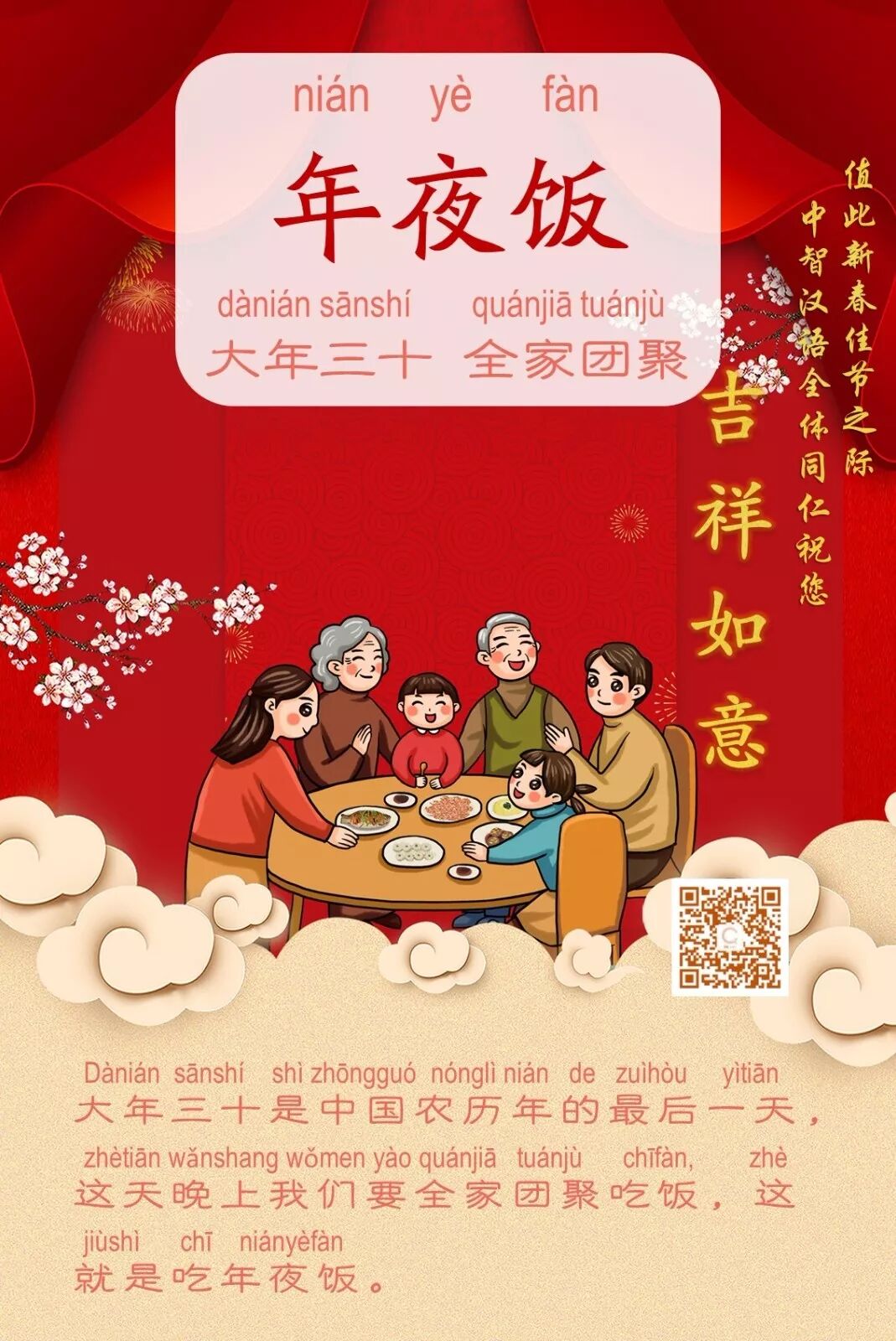 大年三十是中国农历年的最后一天 这天晚上我们要全家团聚吃饭 这就是吃年夜饭